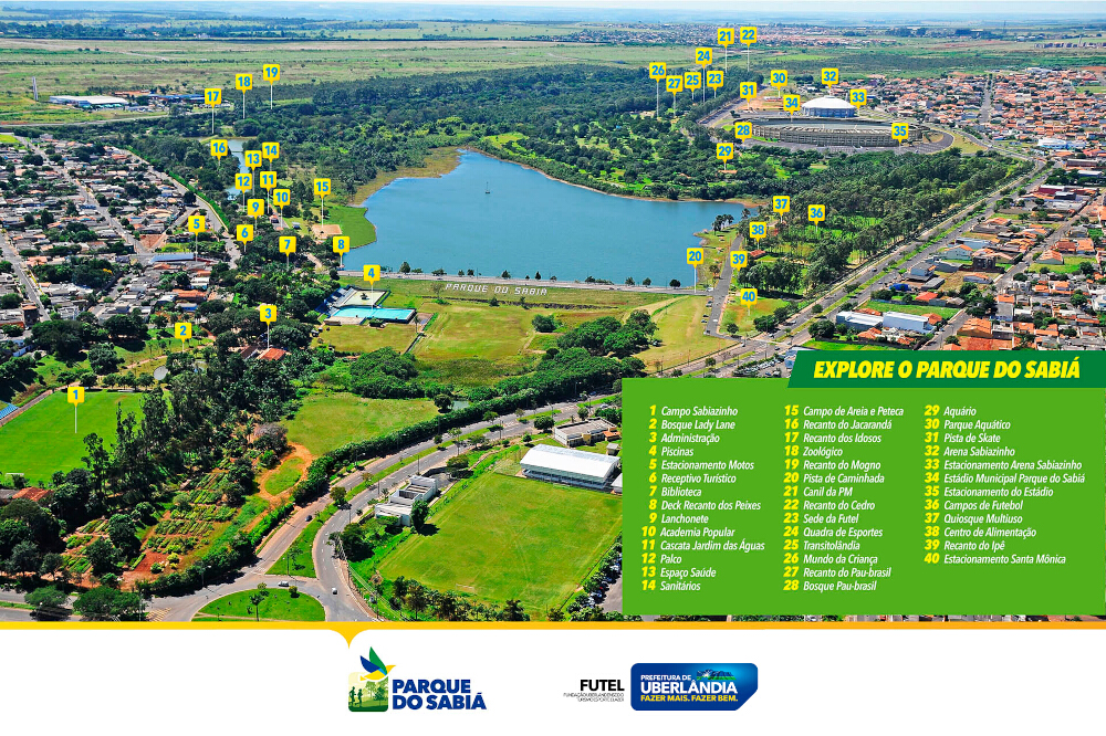O Parque do Sabiá é o principal cartão-postal de Uberlândia, inaugurado em 7 de novembro de 1982 e administrado pela Prefeitura através da FUTEL. Com 1,85 milhão m² de área verde, trilhas, pista de 5 km, zoológico, represa, campos, quadras e áreas de lazer, oferece atividades gratuitas de esporte, convivência e natureza, sendo frequentado por milhares de pessoas todos os dias